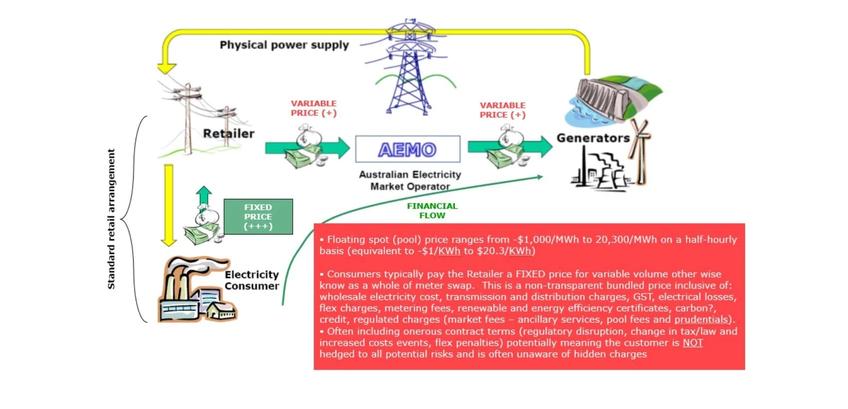 Below [SUPPLY] Generators are stacked from the cheapest to the most expensive. As [DEMAND] goes up, this calls for more generation (on a more expensive basis) and it’s the last generator to be called to equalise demand and supply that sets the price for the state and possibly the whole system.